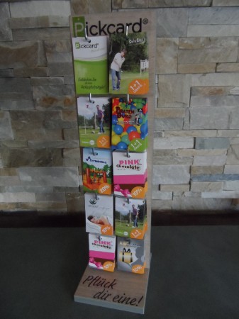 Die jeweiligen Pickcards verschiedener Anbieter mit den unterschiedlichsten Angeboten, wie z. B. Preisnachlässe, 2 für 1, Gratisangebote, hängen am Pickcard-Ständer, der bei ausgesuchten Lokalitäten steht.